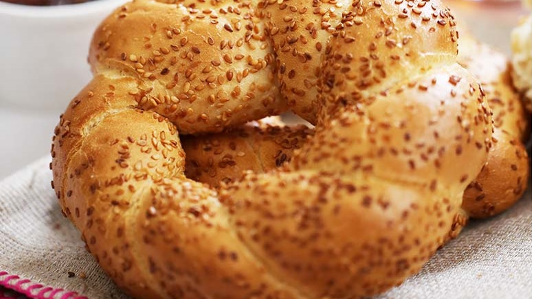 Simit is a circular bread, typically encrusted with sesame seeds or, less commonly, poppy, flax or sunflower seeds, found across the cuisines of the former Ottoman Empire, and the Middle East. Simit’s size, crunch, chewiness, and other characteristics vary slightly by region. It is widely known as Turkish bagel in United States.