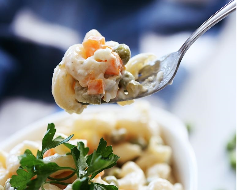 Macaroni salad is a type of pasta salad, served cold made with cooked elbow macaroni and usually prepared with mayonnaise. Much like potato salad or coleslaw in its use, it is often served as a side dish to barbecue, fried chicken, or other picnic style dishes. Like any dish, national and regional variations abound but generally it is prepared with raw diced onions, dill or sweet pickles and celery and seasoned with salt and pepper.