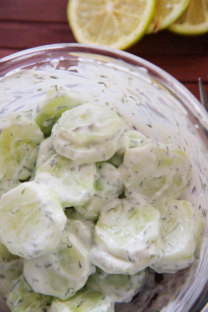 Add the red onion, garlic, mayonnaise, vinegar, dill, sugar, and pepper to the bowl with the cucumbers and stir to combine.