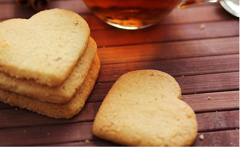 When you’re ready to bake the cookies, preheat the oven to 350 degrees F. Place a disc of dough between two sheets of parchment or waxed paper, and roll out until it is 1/4-inch thick. Use a 3-inch heart cookie cutter to cut out your cookies and place them on a parchment-lined baking sheet. Combine the scraps and re-roll the dough to cut more cookies. You should get about 24 large heart cookies. Put the sheet in the freezer for 10 minutes before baking to help the cookies hold their shape.
